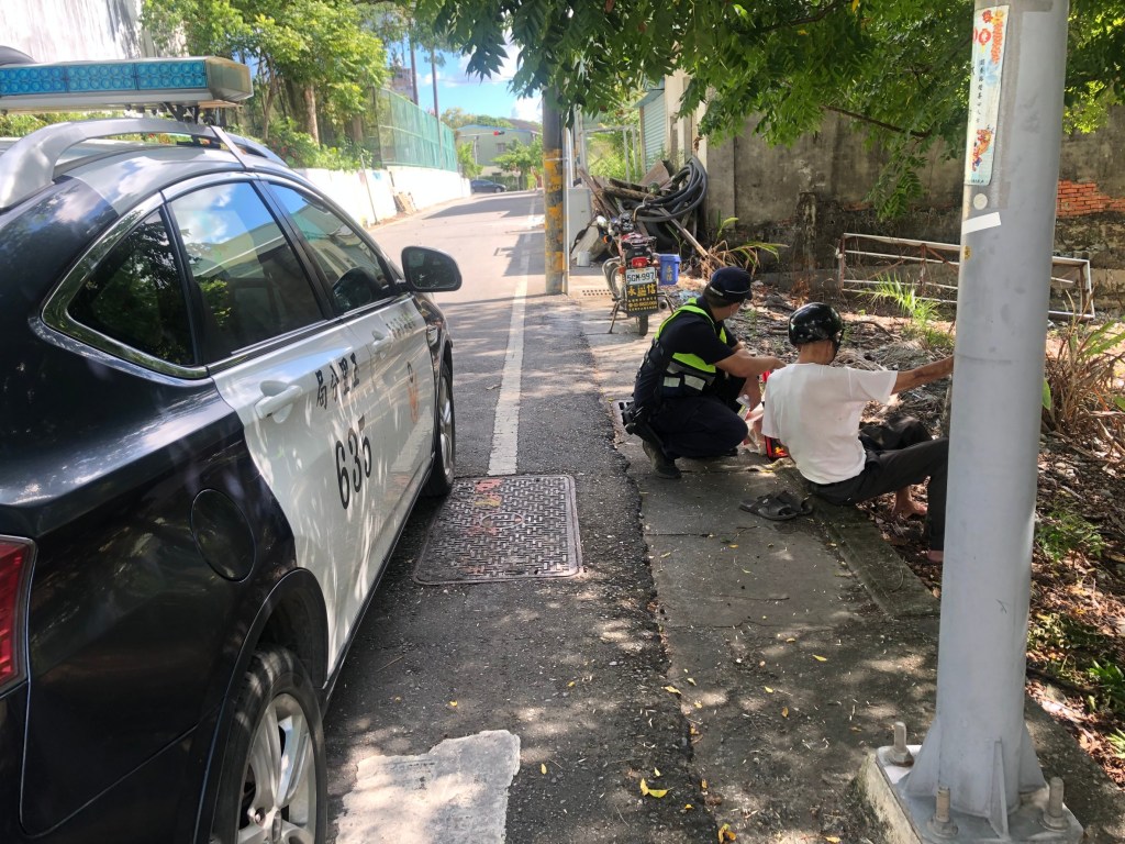 經了解,年約80歲的鄭姓老翁下午駕車前往街上購買物品,因上了年紀駕車時突然無法適應烈陽曝曬,身體汗流浹背頓時感到頭暈目眩,下意識告訴自己先找個陰涼處歇息,於是便把交通工具停置一旁,原打算休息片刻再緩緩駕車返家,卻在這時擔當社區治安的土地公-巡邏員警恰巧行經該路段,而後2員攙扶起後再三確認長者身體安全無虞後,便以巡邏車載送平安送返家中歇息,回到家後老翁家屬對員警的善行表示由衷的謝意。