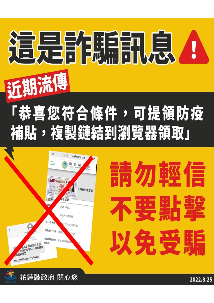 目前詐騙簡訊會以領取防疫補貼的名義,來騙取民眾的個資與金錢,朱局長呼籲鄉親不要點擊受騙,也不要轉傳,收到詐騙簡訊盡快刪除。