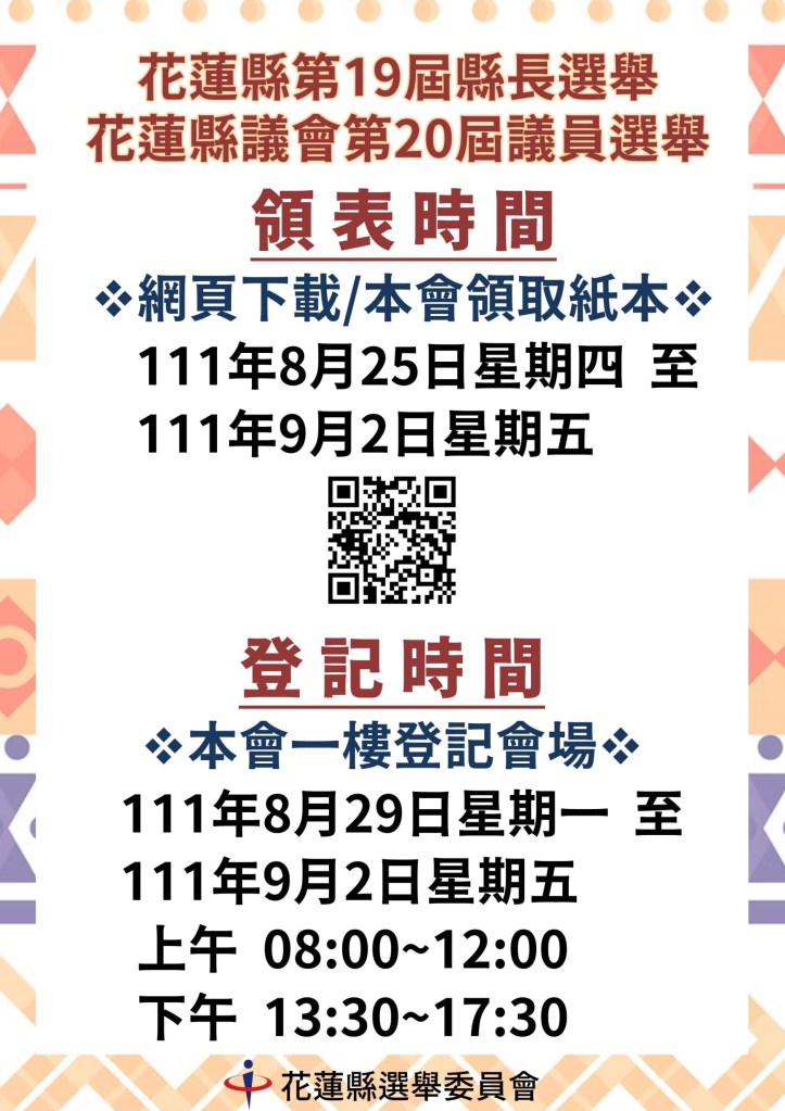 花蓮縣選舉委員會於今(25)日張貼由中央選舉委員會發布之縣長及縣議員選舉候選人登記及發布111年花蓮縣鄉(鎮、市)長、鄉(鎮、市)民代表及村(里)長選舉候選人登記期間、地點、應備具之表件及應繳納之保證金數額受理候選人登記公告。