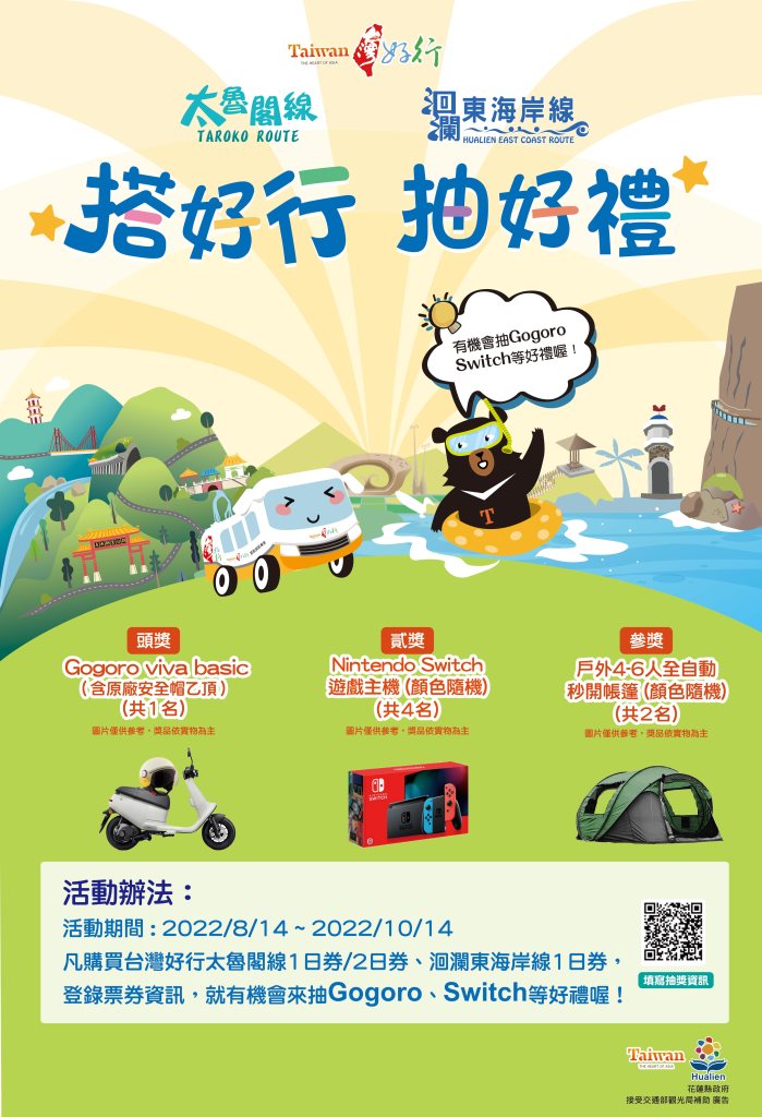 花蓮旅遊正夯,想到花蓮體驗好山好水好風景,搭乘台灣好行310太魯閣線、304洄瀾東海岸線,不用自己開車,輕鬆又便利,購買1日券還有機會抽中Gogoro等好禮!觀光處長張志翔表示,為提供旅客便利的大眾運輸服務,縣府推動台灣好行310太魯閣線及304洄瀾東海岸線,並配合花蓮轉運站於7月1日起正式啟用,將2線起站調整至花蓮轉運站,旅客從花蓮轉運站搭乘2條台灣好行路線,就可以抵達七星潭、太魯閣國家公園、石梯坪等花蓮熱門景點,輕鬆飽覽太魯閣峭壁峽谷及東部海岸無敵海景,適合各地自由行旅客選擇搭乘,2線均可使用電子票證、行動支付或1日券搭乘,現在購買1日券,除了可到路線沿線19家業者憑券消費享優惠折扣,另外於10月14日前上網登錄票券資訊,還可以參加抽獎活動,有機會抽中Gogoro等好禮,千萬別錯過!