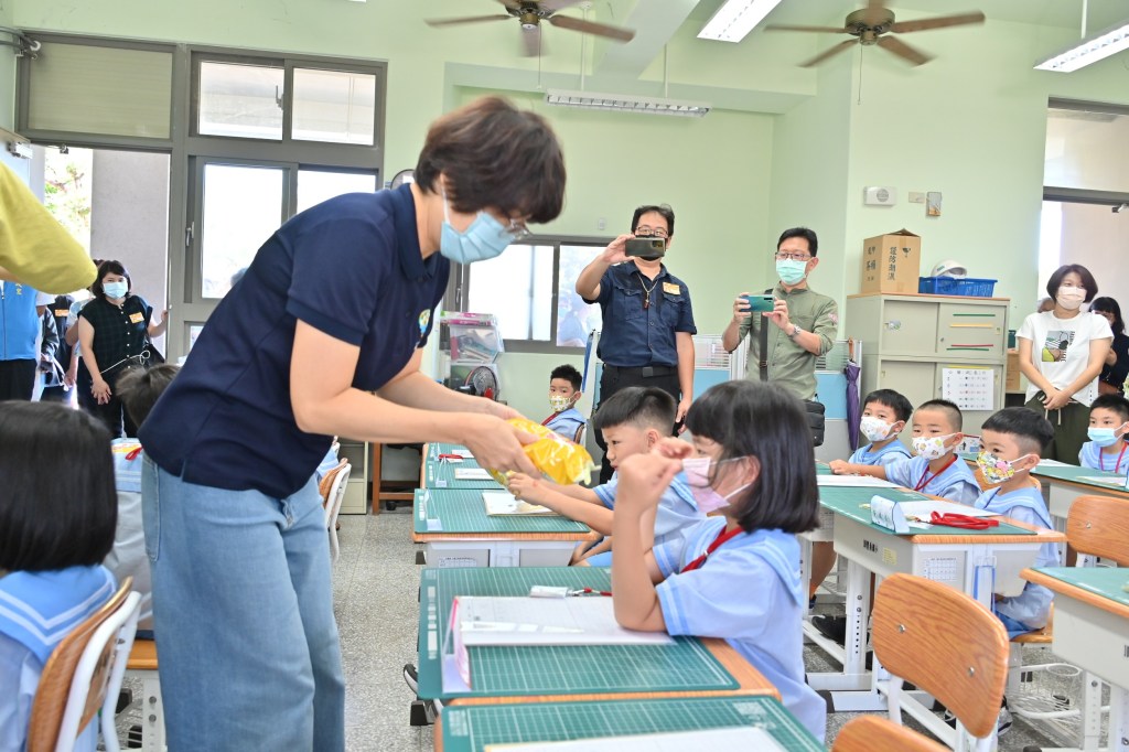 饒慶鈴今早由縣府教育處長林政宏、副處長黃玉燕等人陪同前往寶桑國小,並與校長李倩鈺在校門口向家長師生親切打招呼,除了歡迎學生開學日回到校園,也到一年級教室與學生面對面,了解關心小一新生使用臺東專屬書包的體驗與感受。