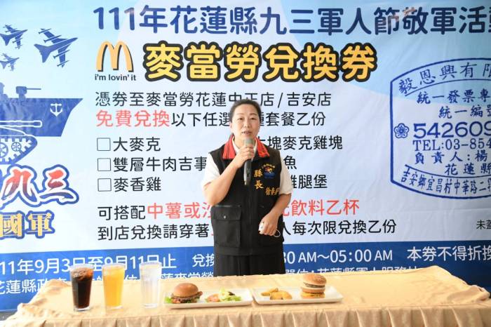 城鄉新聞 記者 姜嘉瑋/花蓮報導 花蓮縣軍人之友社軍人服務站今(31)日上午於花蓮市麥當勞餐廳辦理「榮耀九三 … 繼續閱讀 榮耀九三友我國軍 徐榛蔚致贈餐券感謝三軍官兵辛勞