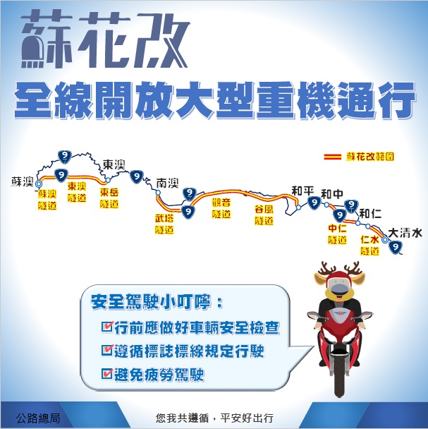 蘇花改111年9月1日起將全線開放大型重機車通行