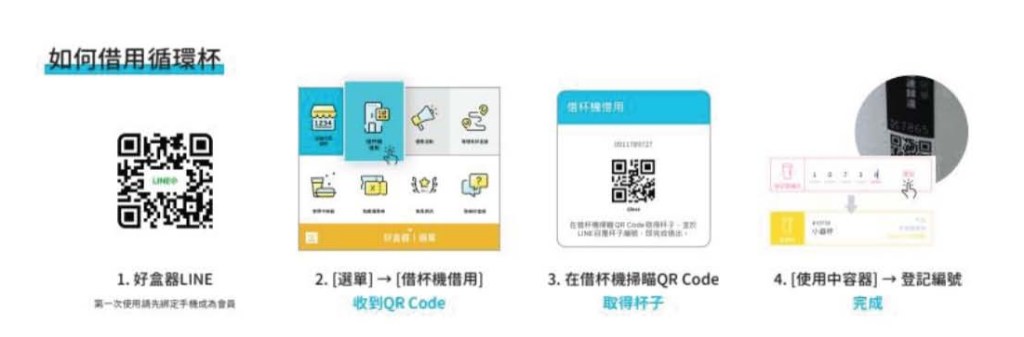 民眾須先於LINE官方帳號搜尋「好盒器」並綁定手機申請會員後,至配合的友善店家消費時,告知店家欲使用循環杯,店員即會出示循環杯,供消費者掃描杯子上的QRCode,操作完畢並點選「送出」,經店員確認後即可使用盛裝飲品。