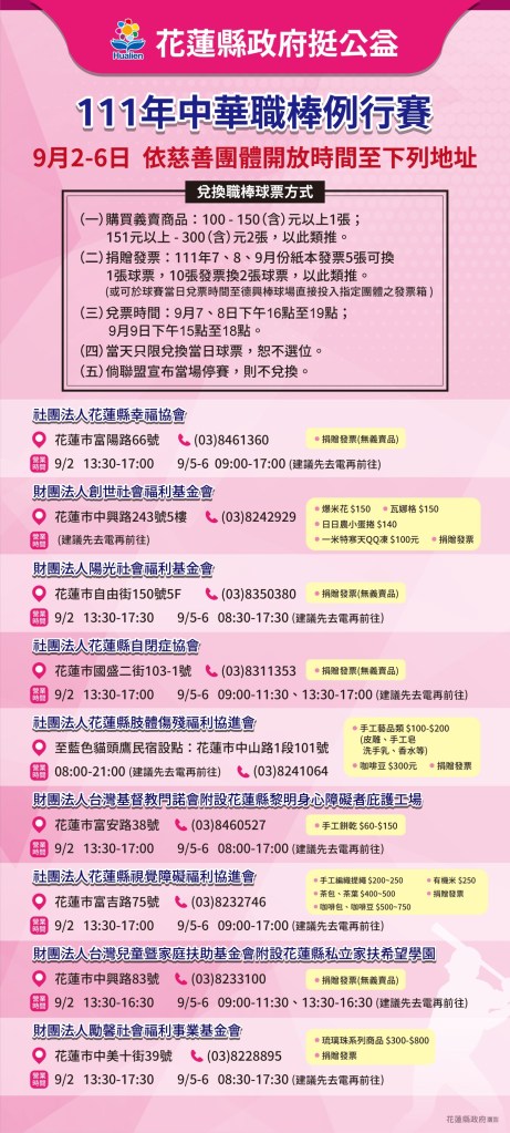 除此之外,花蓮縣依往例邀請弱勢團體、學校基層棒球隊及銀髮族到場看球,請銀髮族於9月7、8日下午16點;9月9日15點起至開賽前至德興棒球場外三壘外側領取當日球票唷!