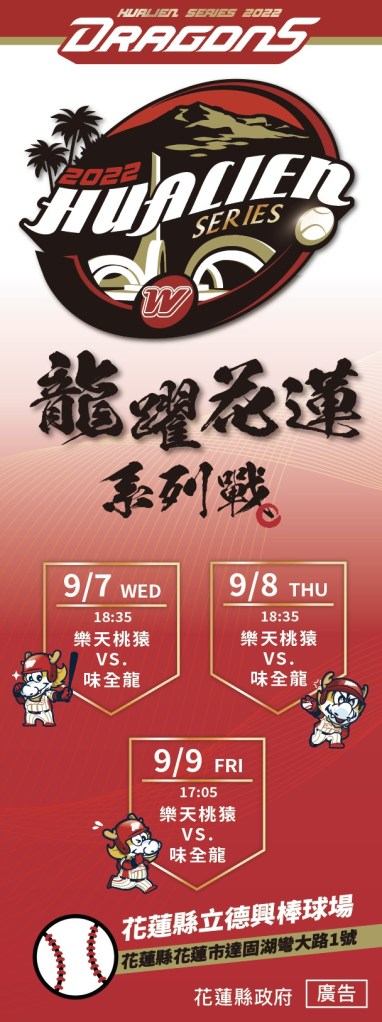 2022年9月份中華職棒共有3場例行賽移師到花蓮舉辦,3場皆由味全龍擔任主場球隊並與樂天桃猿於9月7、8、9日展開3連戰,精采絕倫,球迷朋友們千萬別錯過!