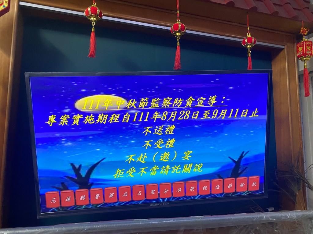 中秋節將屆,花蓮縣警察局玉里分局平日在轄區玉里鎮、富里鄉、卓溪鄉內執行治安、交通及為民服務工作,廣受各界好評與肯定。警察人員依法本即肩負有「維持公共秩序,保護社會安全,防止一切危害,促進人民福利」任務,為塑造政府廉能形象,玉里分局配合縣警察局辦理中秋節監察防貪及反賄選工作,分局長温基興及各級長官利用集會時機,向員警宣導「不送禮、不受禮、不赴(邀)宴、拒受請託關說」及反賄選等規定,亦假轄內金針花季活動至六十石山及各部落豐年祭活動機會積極向民眾宣導,即日起民眾到分局及各分駐(派出)所洽公,會發現電子看板均已播放標語,請您洽公時將包裹(禮品)置於門外,洽公後帶回;此外,值班員警也會登記您的大名,對於您的邀宴、送禮亦會依規定婉拒,以維廉能政風。