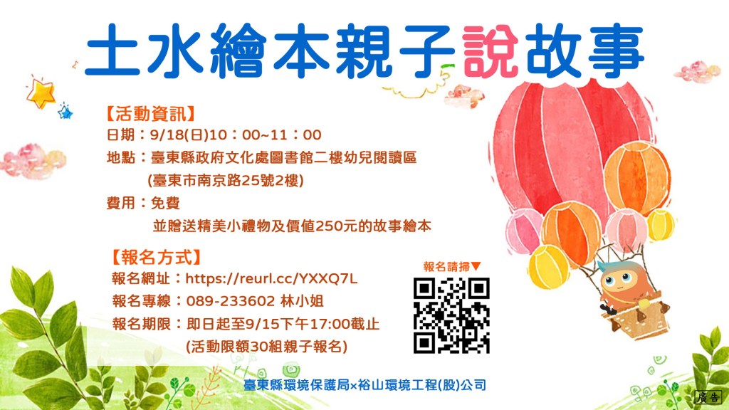 為提升環境污染防治觀念,臺東縣環境保護局將於9月18日上午10點至11點在臺東縣政府文化處圖書館二樓幼兒閱讀區(臺東市南京路25號),舉辦今年第三場次「土水污染防治繪本說故事」活動,現場除了說故事活動之外,還有互動遊戲、並贈送精美小禮物及價值250元的故事繪本,活動採網路線上報名(https://reurl.cc/YXXQ7L)或撥打報名專線089-233602林小姐,限額30組親子參與,即日起至9月15日下午5點止受理報名,或滿額即截止,全程免費,歡迎親子報名。