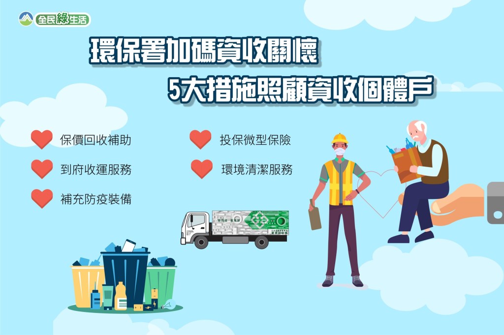 中、低收入戶的資收個體因經濟相對弱勢,且收入不穩定,因此,環保局提供高於市場價格的補助單價收購資收物,每人每月補助上限5,000元;更提供到府收運協助年長、行動不便者少推一里路。110年因應疫情及時提供防疫裝備協助,給予醫療口罩、防刺手套、護目鏡等,讓資收個體戶兼顧防疫及安全。統計109年至111年8月底止,累計補助2,074人次,回收約94.7萬公斤資收物與1,489台廢資訊家電。111年再擴大關懷強度,推出「投保微型保險」以及「環境清潔服務」,避免資收個體戶因撿拾意外,而導致經濟窘境;更協助規劃貯存環境,協理清潔及消毒,提升其環境衛生。截至8月底,已完成91位個體戶微型保險投保及6處環境清潔服務。