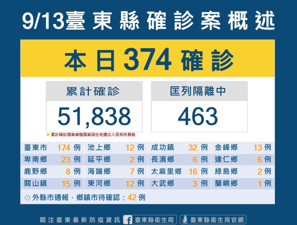 台東縣今(13)日新增374位確診者,332名民眾戶籍或居住地分在台東、42名為外縣市醫院通報。目前台東縣累計確診個案51,838人、居隔者463人。針對COVID-19確診者分流收治情況,台東縣截至9/12下午16點為止,住院收治人數為21、加強版集中檢疫所為37人、居家照護現管人數有1920人。