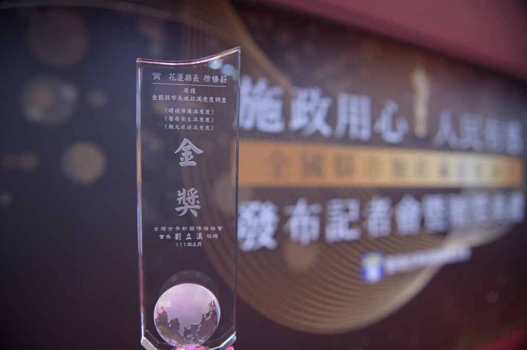 花蓮縣歷年來在醫療衛生及觀光旅遊面向名列前茅,今年更是躋身金獎,顯示地方的進步來自鄉親的支持與鞭策。會中,由台灣世界新聞傳播協會會長劉立漢頒贈「縣市長滿意度銀獎」獎牌予徐縣長,花蓮縣在「環境保護」、「醫療衛生」、「觀光旅遊」等三個面向榮獲金獎,在「社會福利」、「教育品質」、「藝術文化」、「防疫表現」以及「幸福感」等五面向獲得銀獎。
