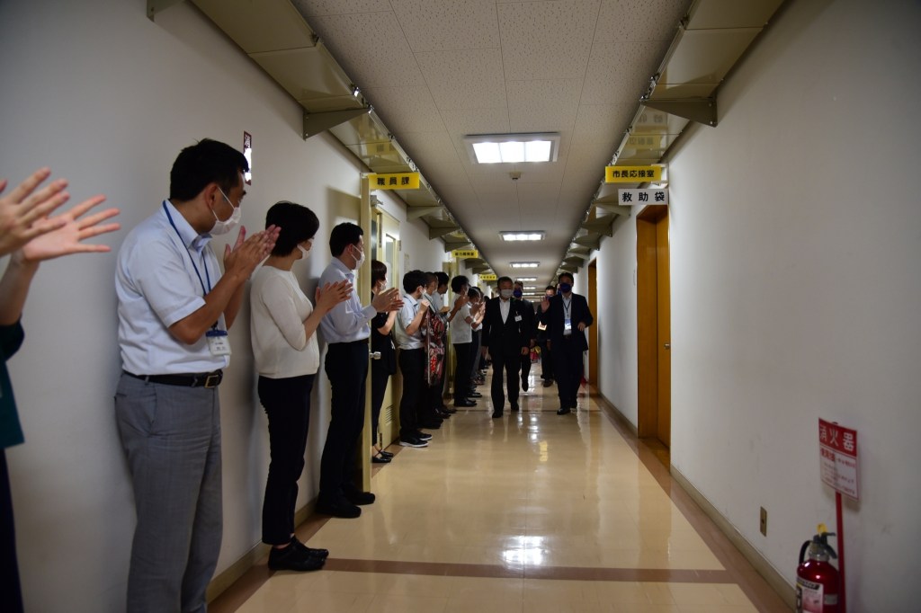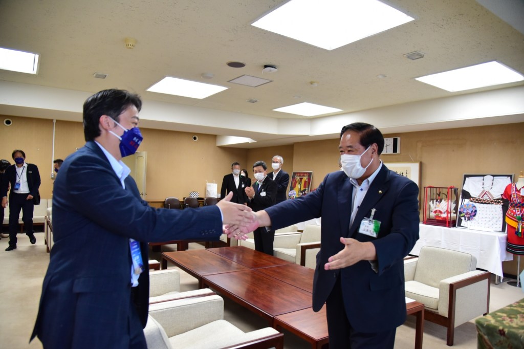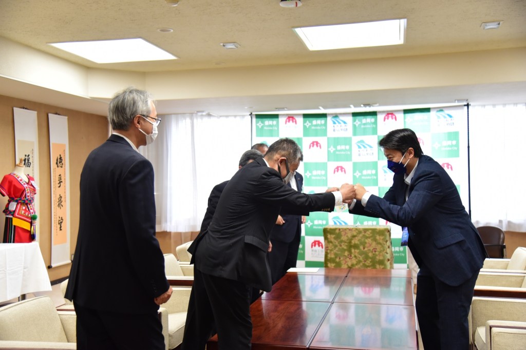 花蓮市長魏嘉賢日本盛岡參訪之行,13日下午拜會盛岡市長谷藤裕明及市議會議長竹田浩久,久違的相見歡,讓現場充滿溫馨又歡樂的氛圍。魏嘉賢市長表示,此次拜訪感觸良多,雖然疫情帶給大家生活的不便,此次出訪也是經過幾番波折,但花蓮市與盛岡市未受影響,未來將在文化、藝術及體育等面向,透過民間交流互訪與合作,期盼彼此友誼長長久久,也期待疫情趨緩後,盛岡山車能夠再度到花蓮參訪。