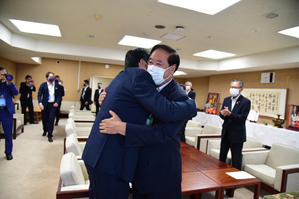 花蓮市參訪團13日下午前往盛岡市役所,受到市長谷藤裕明及員工的熱情歡迎,兩位市長一見面就展開雙臂,緊緊相擁,因為自2019年11月締盟友好城市之後,兩人一別三年才相見。盛岡市議會議長竹田浩久及副議長村上貢一也特地來到市役所,在談到三年前於花蓮接受魏市長熱情接待時,竹田議長說,這些至今仍是大家最美好的回憶。