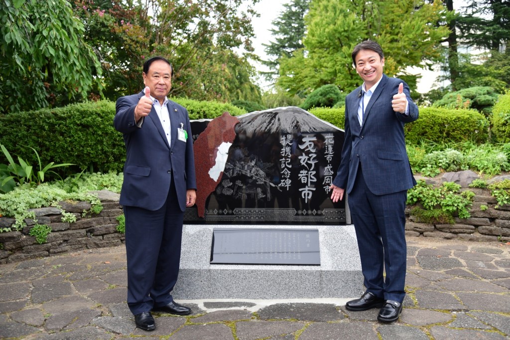 結束市役所拜訪行程,谷藤市長親自陪同魏市長到城跡公園,這裡有去年十一月剛完成的友好城市紀念碑,以花蓮及盛岡的石材為底,將盛岡山車的主題人物「矢之根」及花蓮三大原住民圖騰融入其中,並將書法及石雕工藝技術融入在製作元素裡,有盛岡的岩守山,也有台灣的圖像和花蓮的座標。