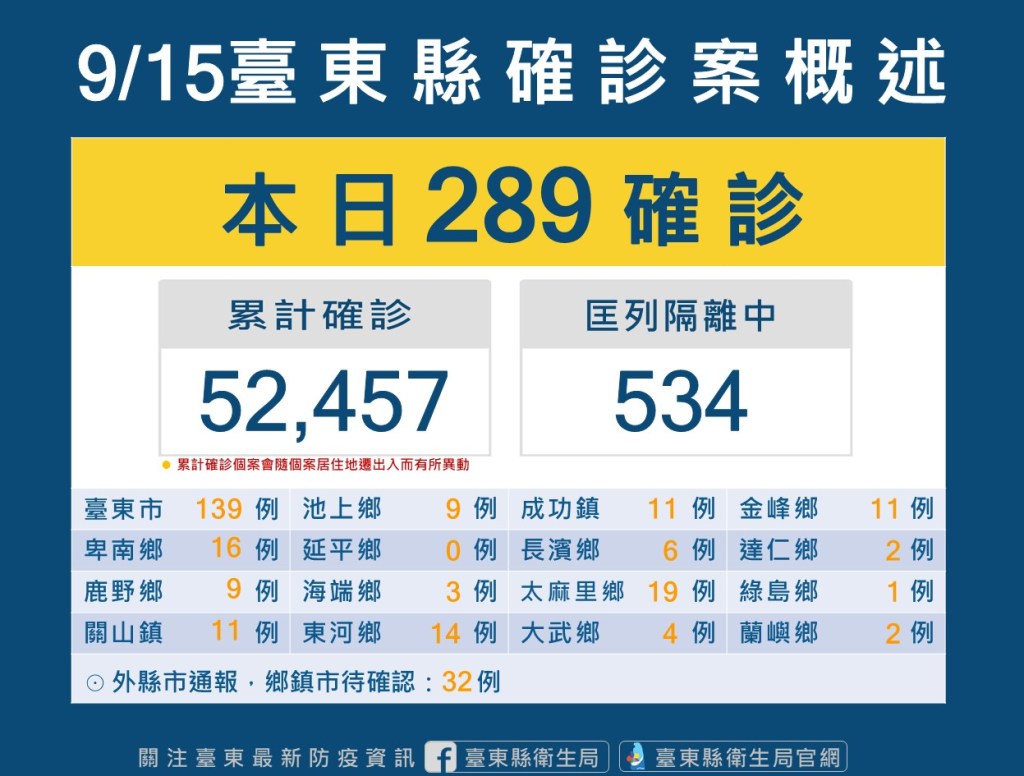 台東縣今(15)日新增289位確診者,257名民眾戶籍或居住地分在台東、32名為外縣市醫院通報。目前台東縣累計確診個案52188人、居隔者643人。針對COVID-19確診者分流收治情況,台東縣截至9/14下午16點為止,住院收治人數為23、加強版集中檢疫所為43人、居家照護現管人數有2134人。