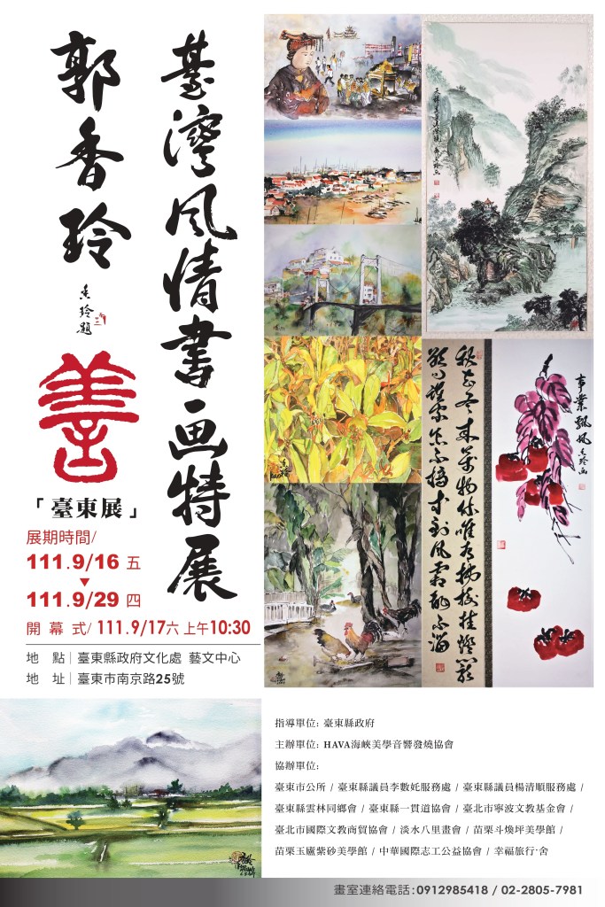 臺東縣政府文化處自今(16)日起至9月29日於藝文中心二樓展出郭香玲「臺灣風情書畫展」,縣府文化處表示,此項展覽集結水彩、書法、書法墨彩等融合不同技法創作,歡迎臺東鄉親及喜好藝術的朋友們,一同前來欣賞郭香玲帶來的臺灣風情。