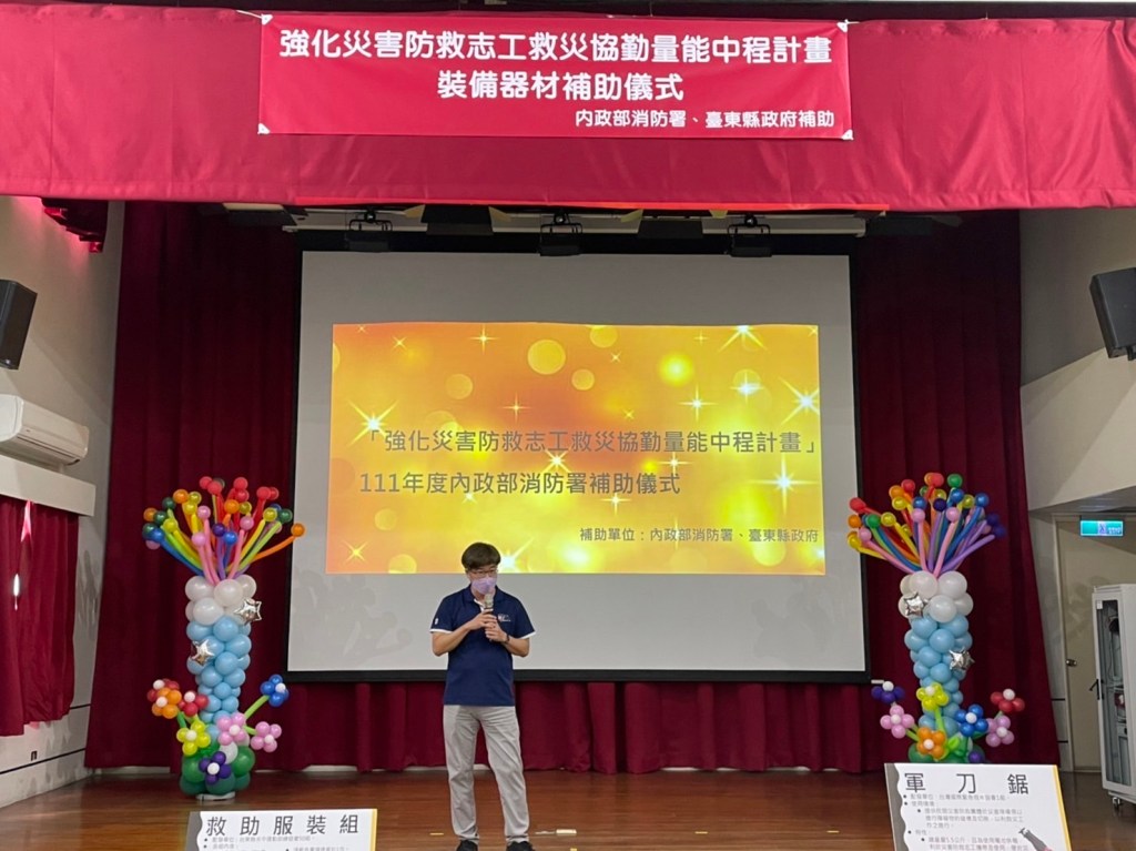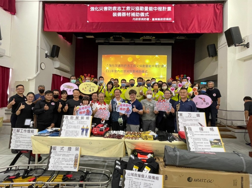 為提供臺東縣居民更安全的居住環境,台東縣消防局今(16)日下午舉行「強化災害防救志工救災協勤量能中程計畫裝備器材補助儀式」,特邀請消防署民力運用組長官蒞臨臺東,與台灣國際緊急救難協會、臺東縣水中運動訓練協會、中華民國紅十字會臺灣省臺東縣支會及中華民國海上救難協會臺東分會等災害防救團體代表共同參與這次活動。