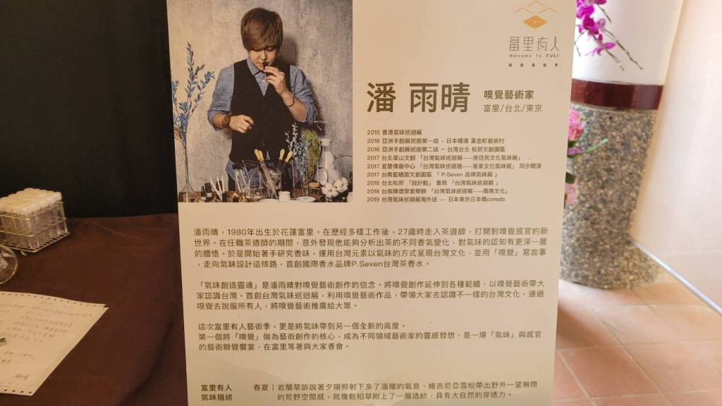 《富里有人嗅覺藝術季》將於九月十七日正式開幕,將持續到十一月六日,每日11點至下午六點,為期約兩個月的展覽。展覽為免費入場參觀,由馥茶堂作為起點,進行一場富里的探索之旅。