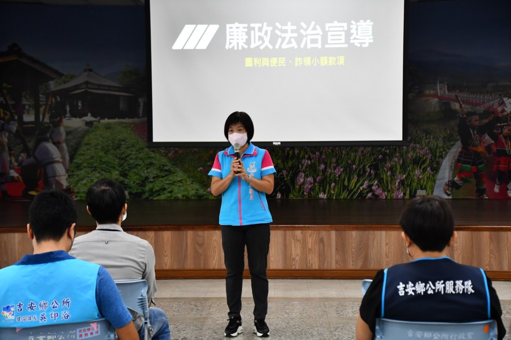 吉安鄉公所為促進公部門廉潔素養、建立正確法治觀念,於今(20)日上午辦理「圖利與便民」及「公務員申領或侵占小額款項」專案法紀宣導,特聘請花蓮地方法院法官吳明駿擔任講座,鄉長游淑貞亦親自出席共學聽講,她表示,為民服務、使命必達是身為人民公僕的重要職責,但在便民與圖利之間,同仁們應建立起正確的法治觀念,營造安心廉政、服務為首的吉安鄉鋼鐵團隊。