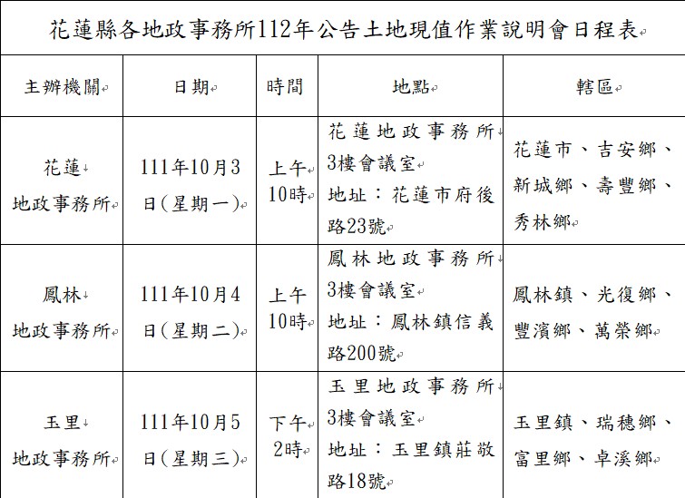 為使民眾及各界充分瞭解地政機關辦理民國112年期公告土地現值地價調查作業情形,花蓮縣三個地政事務所將於111年10月3日至10月5日,陸續召開公告土地現值作業公開說明會,廣徵各方意見。