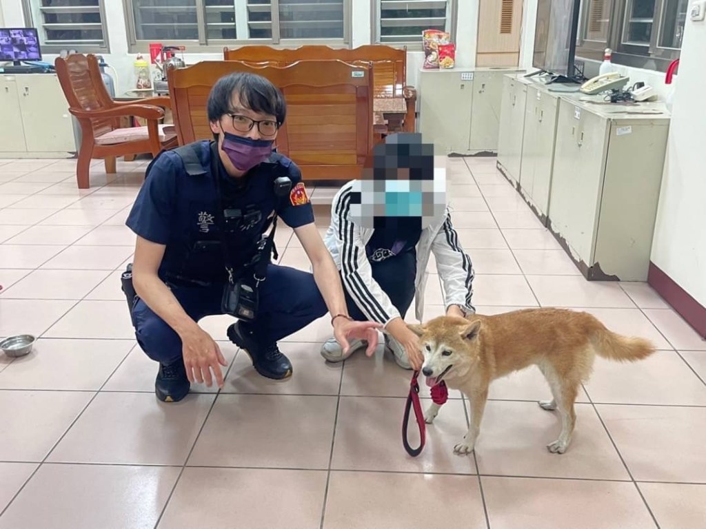 花蓮警分局中華派出所警員伍峯其、陳嘉敏日前接獲民眾報案稱有一隻陌生的柴犬躲在民宅停車場,在角落不斷瑟瑟發抖,民眾不敢輕易靠近、不知如何是好,遂報警求助。員警到場後,見柴犬可愛親人的模樣,且有配戴項圈,判斷應該是走失家犬,一陣連哄帶騙下將狗抱起,柴犬也相當配合跟著警察到獸醫院掃瞄晶片、坐警車回派出所休息。