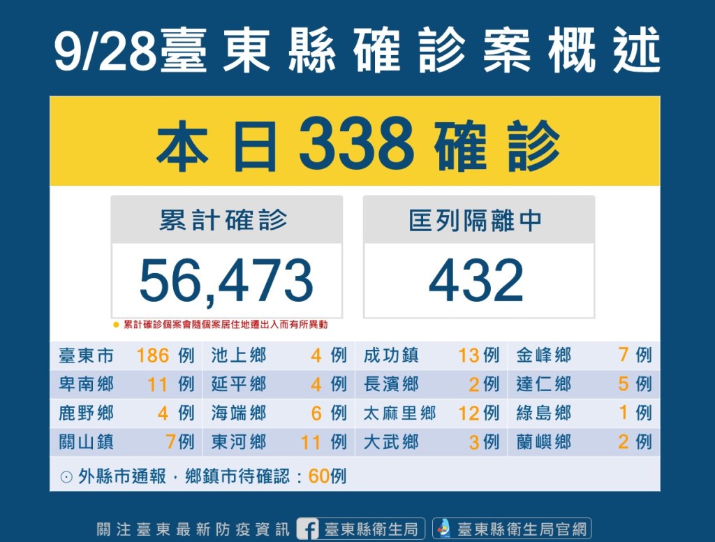 台東縣今(28)日新增338位確診者,278名民眾戶籍或居住地分在台東、60名為外縣市醫院通報。目前台東縣累計確診個案56473人、居隔者432人。針對COVID-19確診者分流收治情況,台東縣截至9/26下午16點為止,住院收治人數為31、加強版集中檢疫所為47人、居家照護現管人數有2276人。
