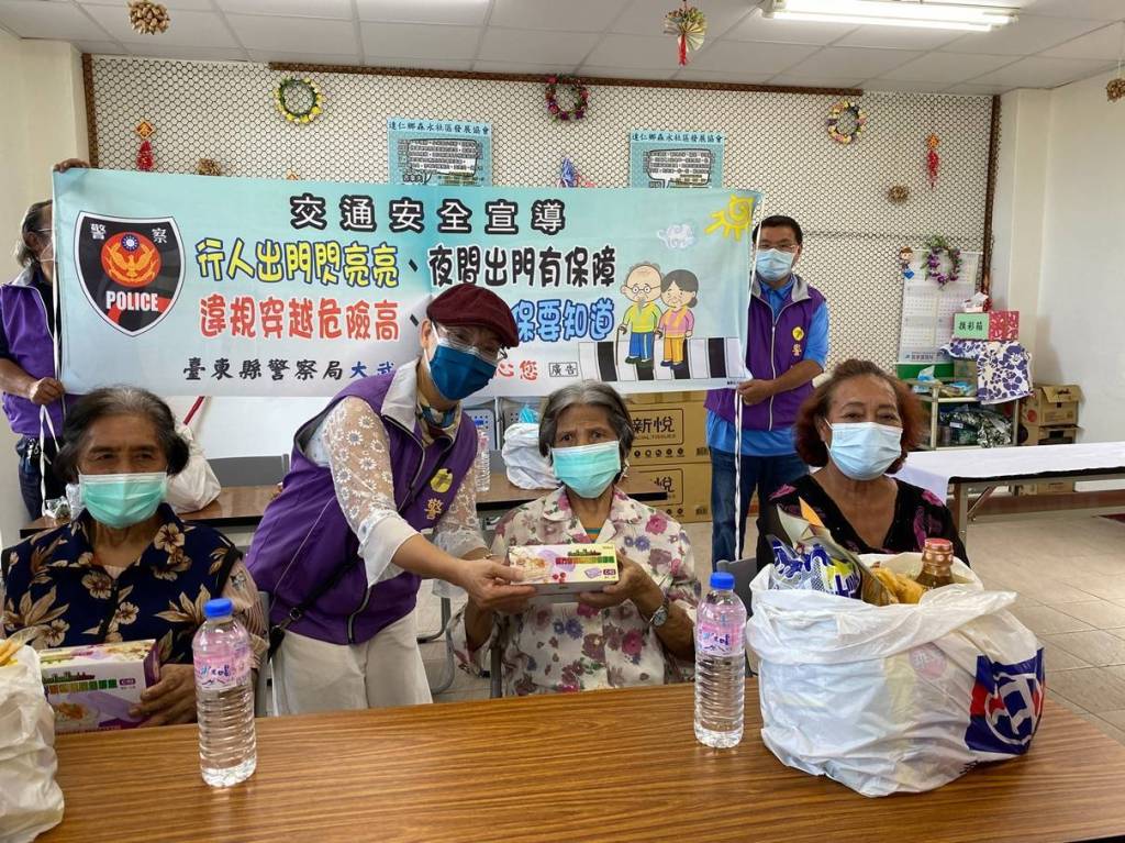 現場除暖心贈送「敬老福袋」外,也特別與長者進行一系列樂活互動,並進行高齡者交通安全宣導,強化長者們交通安全的常識,提高用路安全。現場亦提供具反光功能的宣導品,方便長者們夜間外出時,可配戴式反光條及駕駛電動代步車或機車時,可貼於車身之反光貼紙,增加辯識度。現場充分將行的安全與社會關懷相互結合,共同度過感恩溫馨的美好時光。部落長者們表示,整場活動備感窩心及暖心,感謝分局及警廣如此用心舉辦。警廣臺東分臺臺長黃建榮表示,在重陽節前夕,期盼藉此活動抛磚引玉,喚起更多善心,關心偏鄉長者的生活。