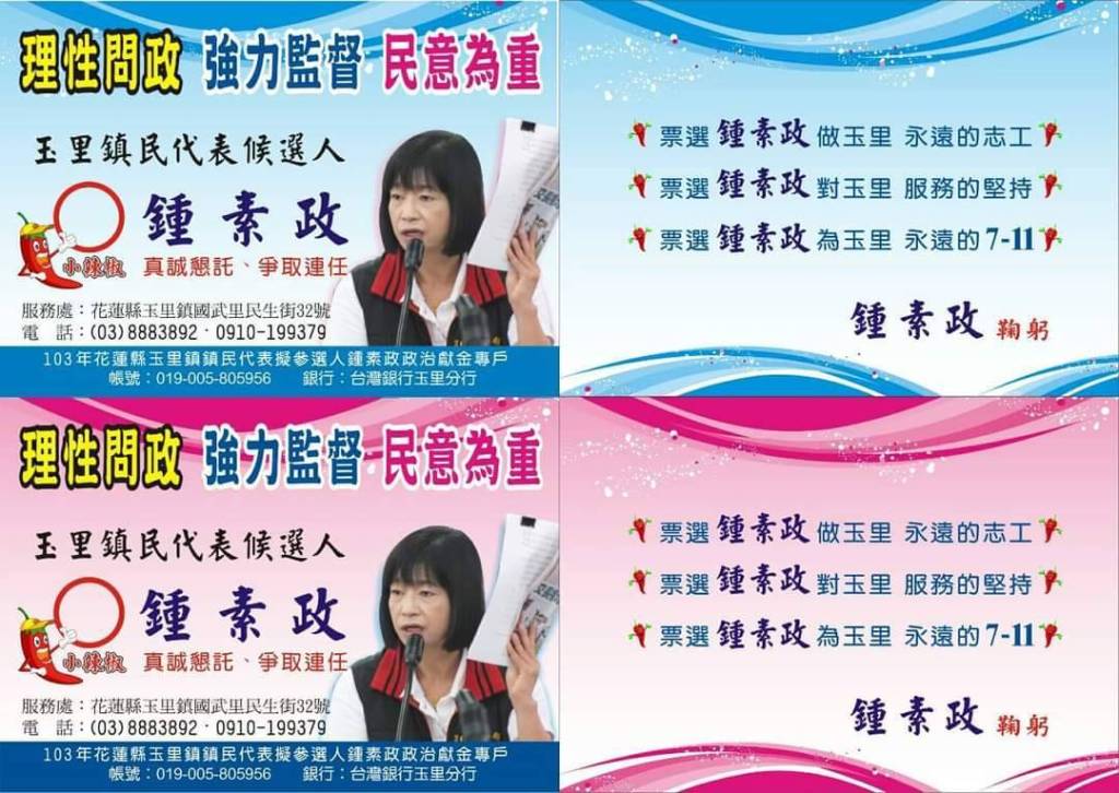 鍾素政當過玉里鎮四屆的鎭民代表,有紮實的問政經驗,為了落實地方建設、強力監督鎮政發展而努力,做人民與公家單位溝通的橋樑,人稱政壇小辣椒的鍾素政,多次在代表會上進行強而有力的質詢,站在第一線為鎮民把關,凡事親力親為、深入鄉鎮,去了解地方鄉親的需求,同時也擔任志工,凡舉環保、捐血、捐款送物資等大大小小的公益活動都能看見鍾素政的身影,如今身為義消第三大隊的隊長,在918地震中更是全身心投入救災,為了受災的鄉親們日夜奔波,只要玉里鎮的鎮民需要她,那個有實力、魄力、行動力的鍾素政就會出現在大家身邊,與鄉親一起為玉里創造美好未來。