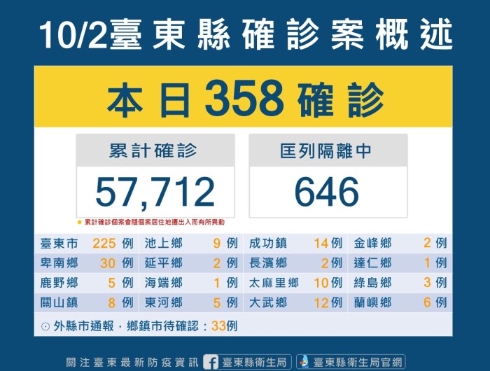 城鄉新聞 記者 姜嘉瑋/臺東報導 台東縣今(2)日新增358位確診者,325名民眾戶籍或居住地分在台東、33名 … 繼續閱讀 台東縣今新增358確診案例 10/3日起開放第二階段莫德納次世代雙價疫苗 饒慶鈴呼籲符合資格民眾踴躍接種