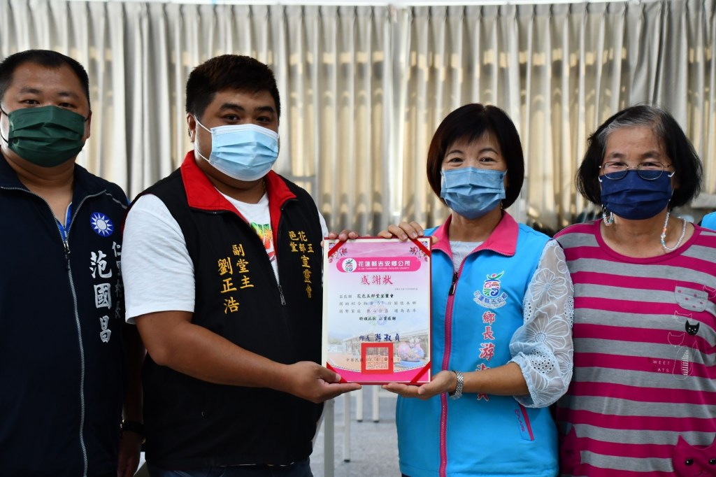 坐落於仁里村的花邑五部堂宣靈會,響應吉安鄉照顧弱勢到位關懷,今(2)日上午於仁里社區活動中心辦理物資發放活動,鄉長游淑貞特前往關心並親贈感謝狀,代表受惠鄉親謝謝鄉內有為年輕人用身體力行,共啟弱勢家庭救助共融的適性美好。