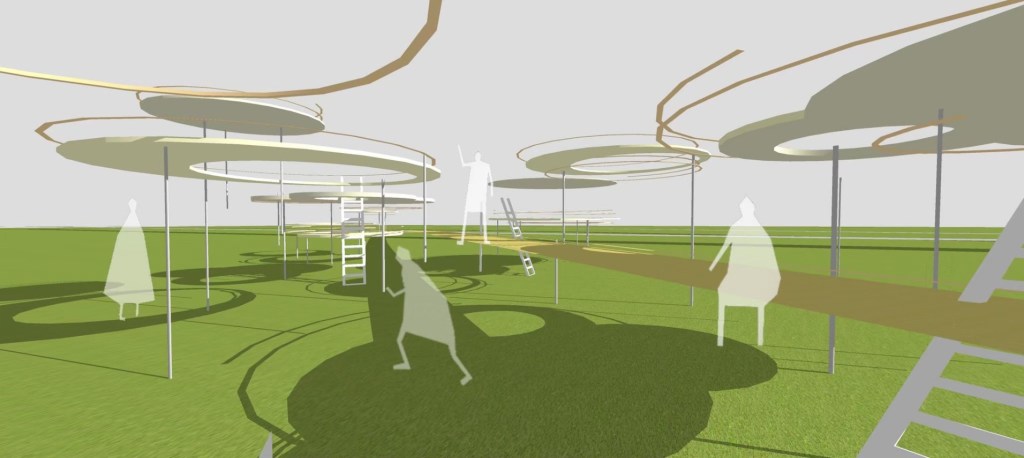 主作品之一「南藝大建築所B群」的《讓我們圈在一起》,同樣針對展出空間全新創作,作品由一層層圓形大平台建構而成,就像是在草地上冒出來的輕柔泡泡一般,B群也為此場域設置了一個長廊,就像一雙長長的手,伸出雙臂迎接大家,希望泡完溫泉的人來到這個長廊,大家一起坐在平台上看星星,讓身心全然放鬆。