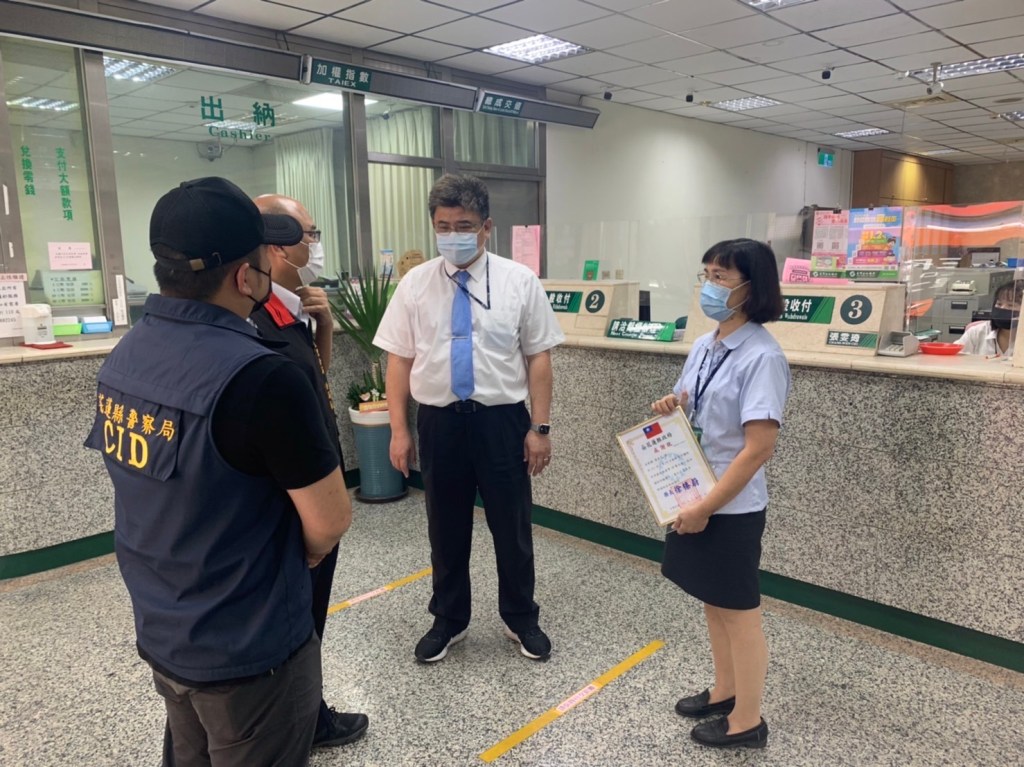 由於日前玉里土地銀行與員警共同聯手,關懷提問成功阻止1件金額達48萬元的詐騙案,該案為7旬婦接獲假檢警來電稱涉嫌販毒不匯款將有牢獄之災,並用威脅、恐嚇方式若不照做將對小孩不利,已讓婦人失去理智疏於查證,在警方及銀行的勸阻下老婦無損失任何財產;昨日分局長温基興特率偵查隊長黃宸緯、偵查佐陳暐傑前往玉里土地銀行,表揚辦事員黃金花積極阻詐成功,親頒感謝狀表達誠摯的謝意。