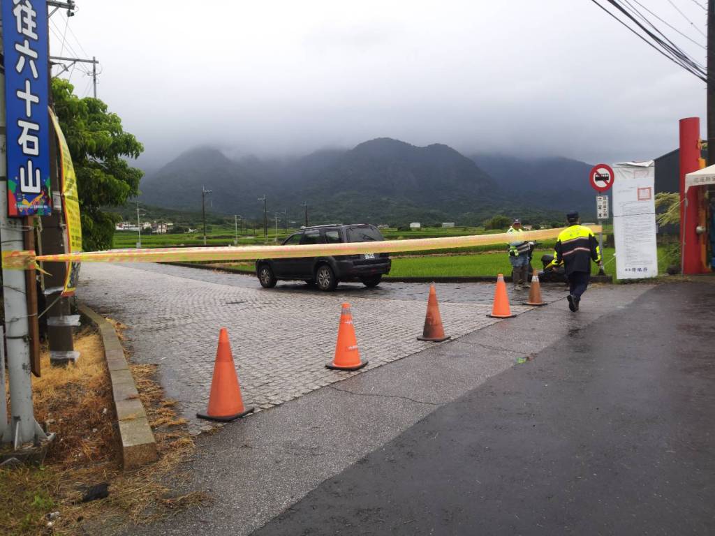 10月8日連假首日,位於富里鄉的六十石山,下山路段約3.5公里處因連夜豪雨關係造成道路坍方,玉里分局東里派出所所長林昭光、副所長邱金雄得知立即前往4公里處拉起封鎖線,管制人車通行,並通知鄉公所協助搶修;另外往六十石山上山路段產業道路5公里處,該處亦有落石導致無法通行,竹田派出所副所長徐毅承、警員劉映君前往入口處拉上封鎖線及放置三角錐,為安全起見,請竹田巡守隊協助一同在山下警戒,請遊客勿上山。在玉里鎮部分,上山路段產業道路7.4公里處,因豪大雨造成土石鬆動,沿途有落石坍方無法通行,觀音所副所長黃宗祥、警員吳逸榮前往3.7公里處拉起封鎖線及放置三角錐,隨後經觀音里里長聯繫鎮公所,積極搶通中,請民眾勿前往。