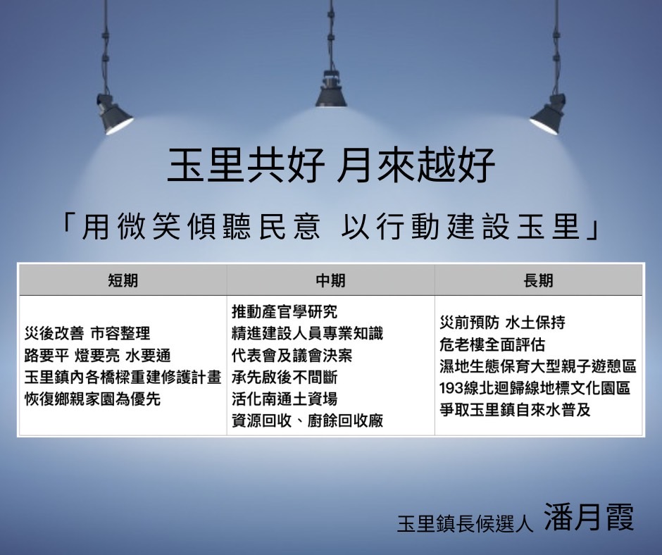 0918大地震造成大樓倒塌、橋樑斷裂,漫長的重建之路須得一步一腳印,玉里鎮長參選人潘月霞針對玉里的建設,做出短、中、長期計畫,先整合資源並統一安排,以恢復鄉親家園為第一優先,提出以下規劃: