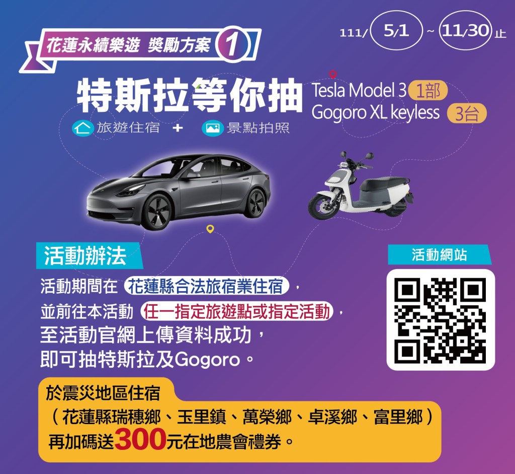 0918池上強震強震造成遊客紛紛取消原本到花蓮的出遊規劃,嚴重衝擊花蓮觀光產業,尤其是南區的旅宿業首當其衝。花蓮縣政府為了鼓勵外縣市民眾至花蓮南區旅遊,提撥1000萬於震後觀光產業重建,凡外縣市自由行遊客於10月15日起,在5個受災鄉鎮住宿,即補助旅宿業者每房每日500元,另外遊客只要登錄住宿發票或收據等資料,即可現領300元在地農會禮券,還可抽特斯拉汽車和Gogoro機車。