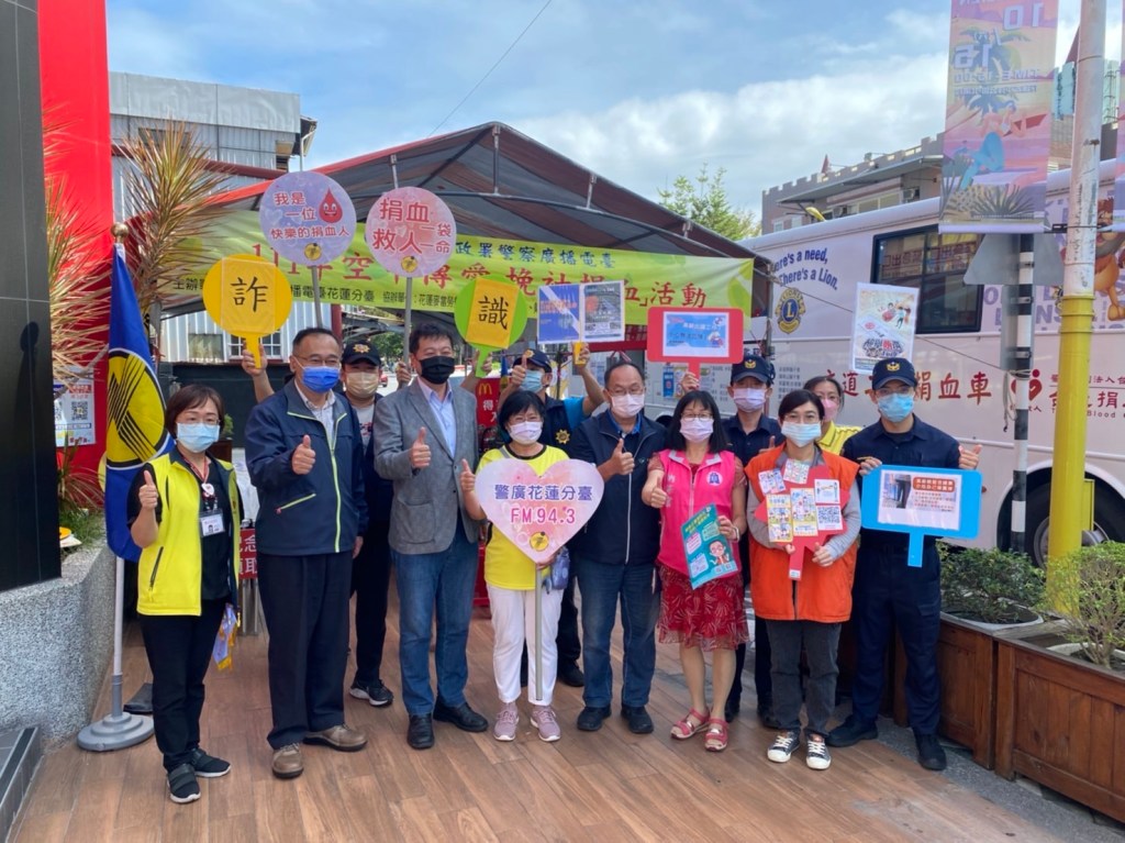 同場加映,鐵路警察局花蓮分局也到場聲援並辦理鐵路平交道安全及防詐騙宣導活動,在分局長張天賜的率領下,鐵警同仁一一挽袖捐熱血, 除了代表警察為民服務的熱忱跟正義精神,也更能獲得民眾的支持與肯定。
