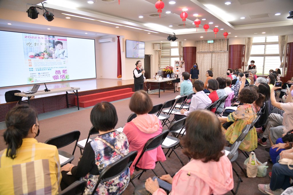由花蓮縣政府社會處主辦及花蓮市婦女會承辦的「酷老樂活」名人講座,今(21)日於花蓮縣府大禮堂舉行舉辦,此次特別邀請到健康暢銷書作家、現任癌症關懷基金會董事長陳月卿擔任此次講師,分享「吃對全食物」的食療保健方式,縣長徐榛蔚在社會處長陳加富陪同下親臨講座現場,一同與婦女們學習各種食材攝取觀念及養生飲食原則。