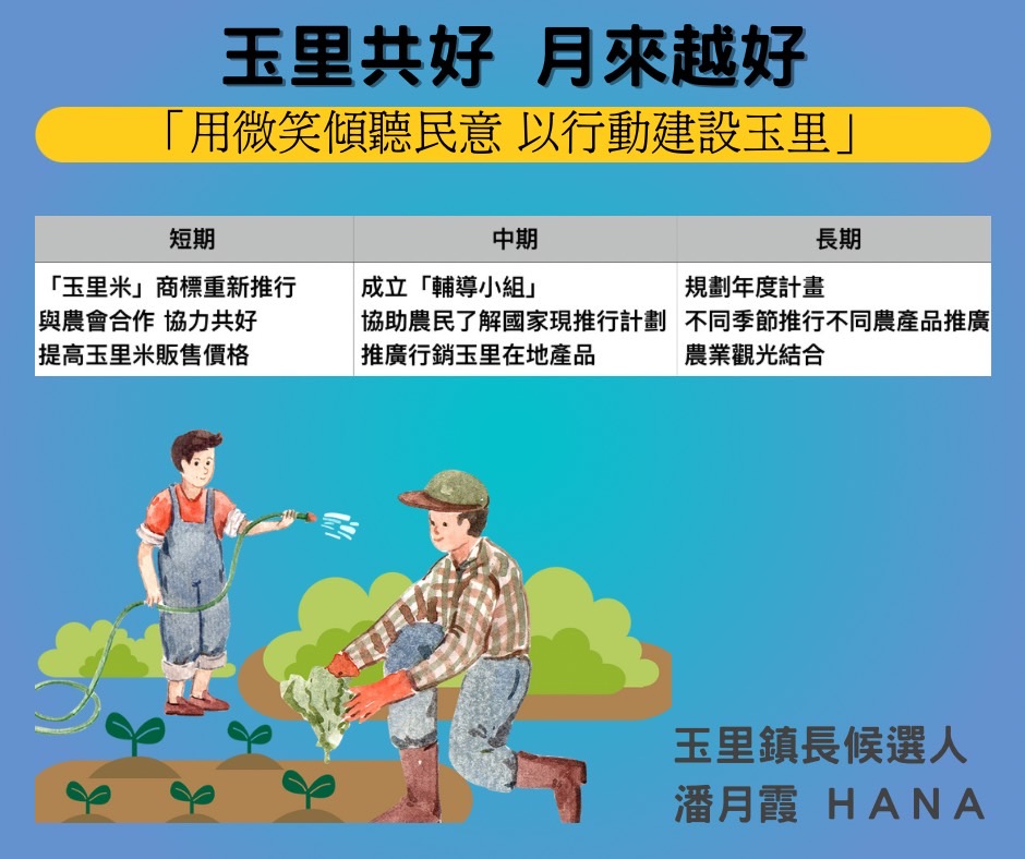 潘月霞是菸農的媳婦,對於農民的生活有深刻的體認,玉里是農業大鎮,全台灣種植面積最大,要讓一級產業擁有最強競爭力,講求的是政通人和,地方政府必須與農政單位同心協力一起陪著農民往前走,一起把玉里農產品推向世界。