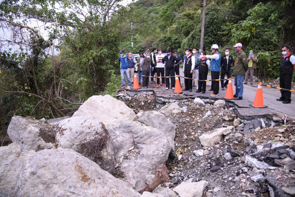 下午會勘行程重點, 富里鄉六十石山因地震導致道路多處損壞,以及下邊坡損壞與擋土牆損壞,另因後續連日豪雨導致崩塌整體災情擴大,縣府規劃重鋪厚混凝土路面、厚AC路面、碎石級配底層鋪壓等方式,並搭配掛網噴植及擋土牆進行復建工程,所需總經費達5,172萬。