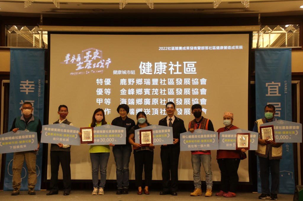 「健康城市組」成績如下,健康社區獎:特優—鹿野鄉瑞豐社區發展協會、優等—金峰鄉賓茂社區發展協會、甲等—海端鄉廣原社區發展協會、佳作—海端鄉崁頂社區發展協會。幸福社區獎:特優—關山鎮中福社區發展協會、優等—關山鎮豐泉社區發展協會、甲等—太麻里鄉查拉密社區發展協會、佳作—金峰鄉新興社區發展協會。藝文社區獎:特優—金峰鄉正興社區發展協會、優等—卑南鄉下賓朗社區發展協會。安心社區獎:特優—關山鎮北庄社區發展協會、優等—金峰鄉嘉蘭社區發展協會、甲等—海端鄉加拿社區發展協會。