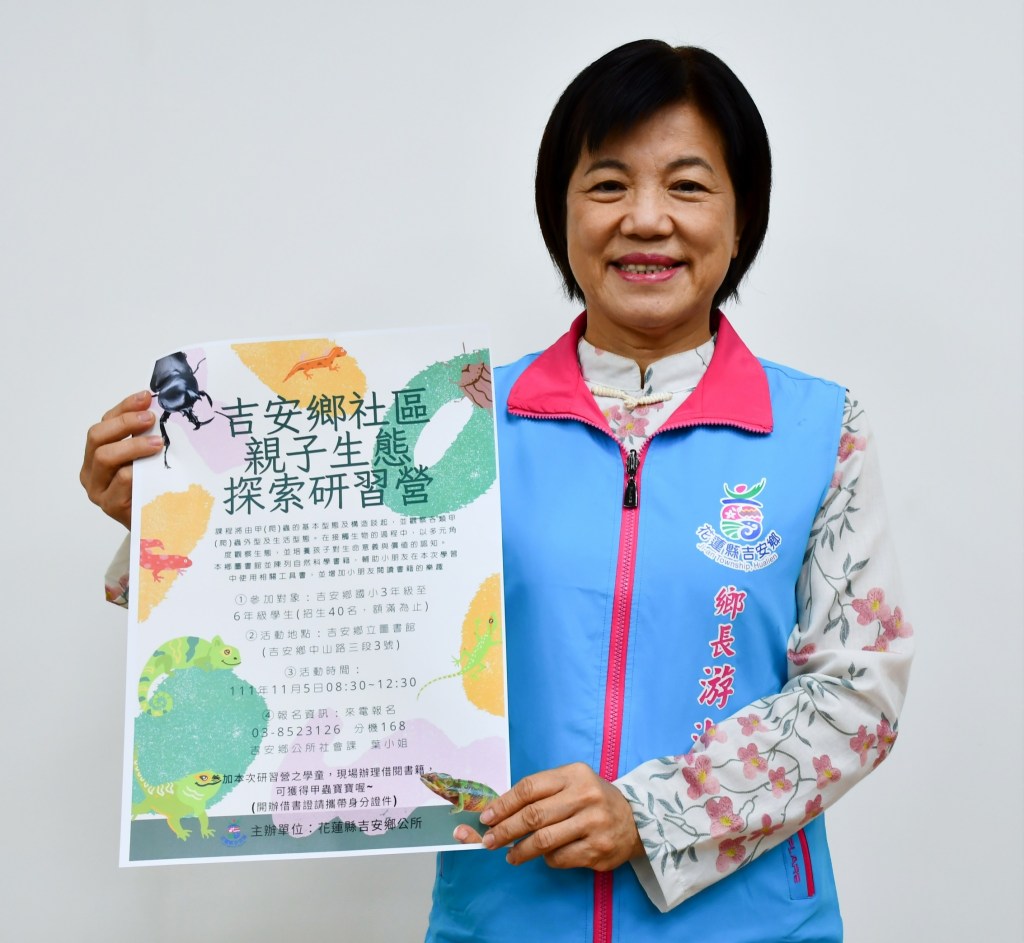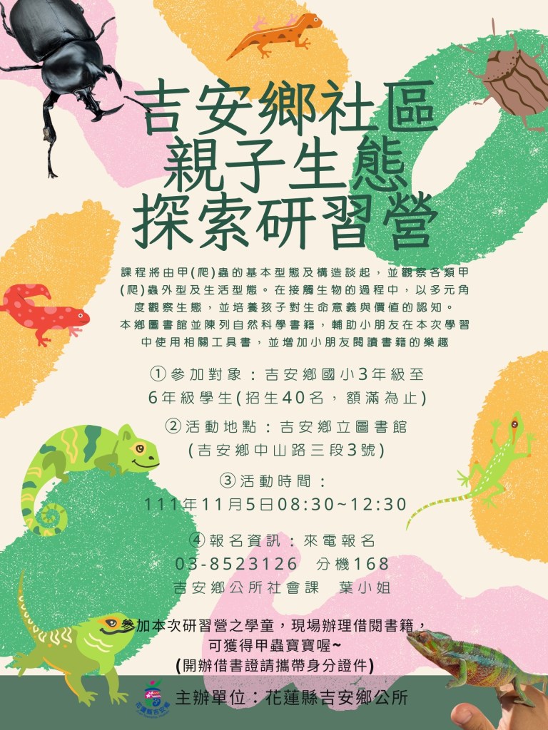 吉安鄉公所促進社區孩童認識自然生物的豐富多樣性,11月5日將於吉安鄉立圖書館辦理「親子生態探索研習營」,特別聘請專業講師帶領親子家族認識甲蟲與爬蟲類,透過現場觀察了解昆蟲與自然環境的生態關係,同時結合圖書館資源,鼓勵借閱相關知識書籍,滿足孩子對自然世界的好奇。鄉長游淑貞邀請社區親子家庭踴躍報名,參加活動並現場借閱圖書,還可以將「甲蟲寶寶」帶回家唷!