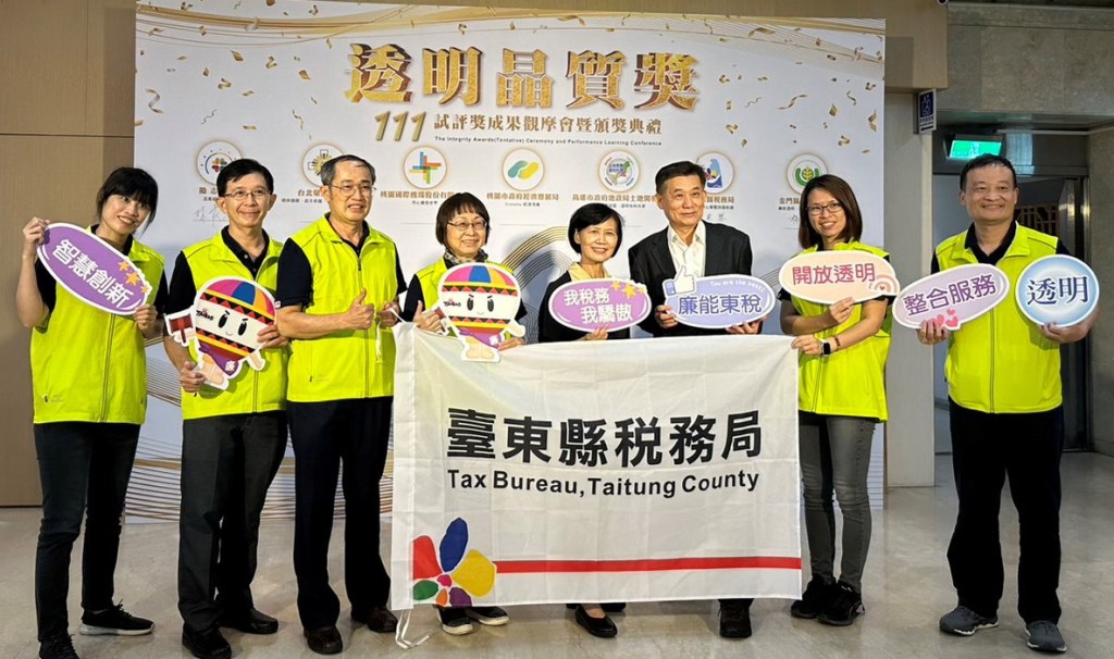 臺東縣稅務局創新便民稅務行動智能服務獲肯定,榮獲「111年透明晶質獎試評獎特優機關」獎項,法務部廉政署日前假國家圖書館辦理「透明晶質獎試評獎成果觀摩會暨頒獎典禮」,由法務部長蔡清祥主持,並邀請全國中央及地方機關出席,臺東縣稅務局長李素琴率團隊出席受獎,並分享臺東稅務局廉能創新、愛心辦稅之經驗。