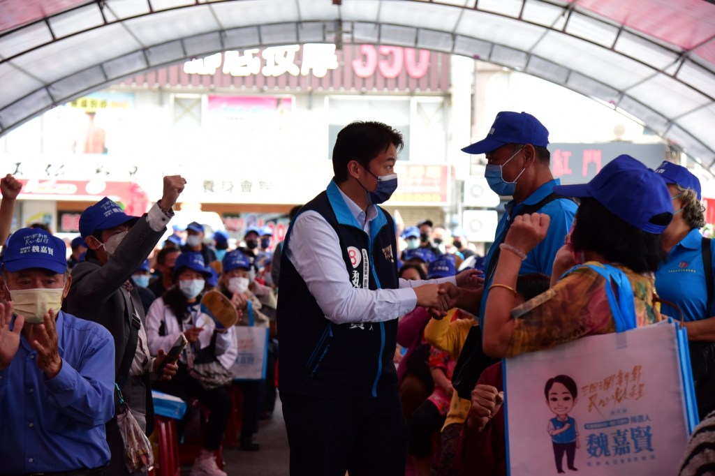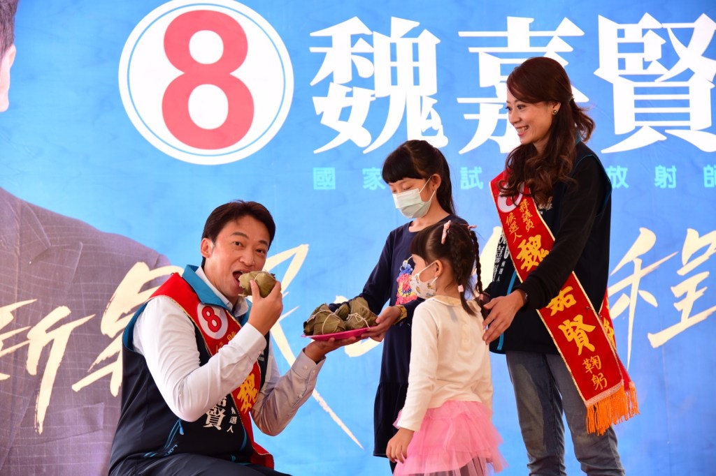 這次為候選人披掛彩帶的儀式特別溫馨,魏嘉賢的妻子吳韻晨親自為丈夫披上候選人彩帶,魏嘉賢的兩位寶貝女兒YoYo跟MoMo也到台上餵「市長爸爸」吃下象徵「包中」的包子跟粽子,壓軸的則是由花蓮市政諮詢委員會主任委員鍾文欽獻上的「好采頭」來加油打氣。隨後一家人也握緊並高舉彼此的手高喊「魏嘉賢,凍蒜!魏嘉賢,凍蒜!」現場氣氛熱鬧又溫馨