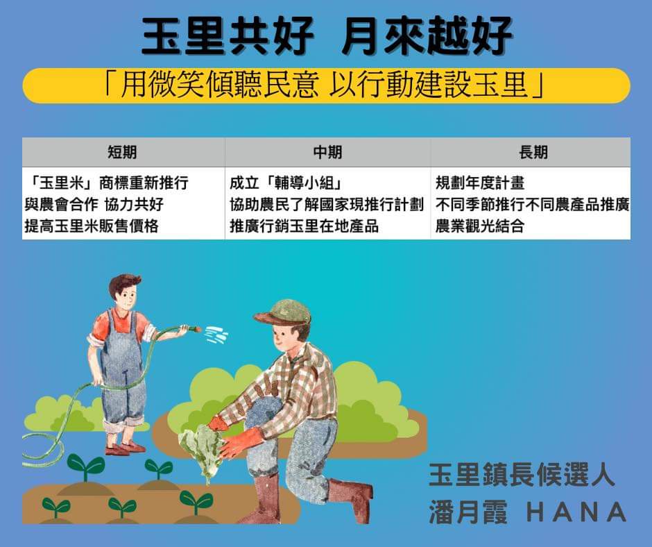 玉里鎮長候選人潘月霞在政見發表會上提到,近十年來,玉里鎮快速的人口老化、商業及周邊經濟效益沉寂,我們要創造玉里自己的轉機,不是把議題停留在攻擊過去的施政作為,不要謾罵,溫柔堅定的帶領玉里鎮往前走。同時承諾,要做到鎮內工程絕對的透明化、創建更便捷的網路查詢平台、鎮內商業極大化、促進各項產業的觀光發展、辦理所有的體育賽事,讓人潮進到玉里來,還要積極推動優質的玉里米及農特產品,擴充通路讓世界看到,不獨厚特定廠商,均衡發展,要用拼命的精神帶領玉里鎮公所,擔任副議長的經驗,能夠帶領新團隊創造政通人和、人和政通的玉里,揮別過去、改變現在,用微笑傾聽民意、以行動建設玉里。
