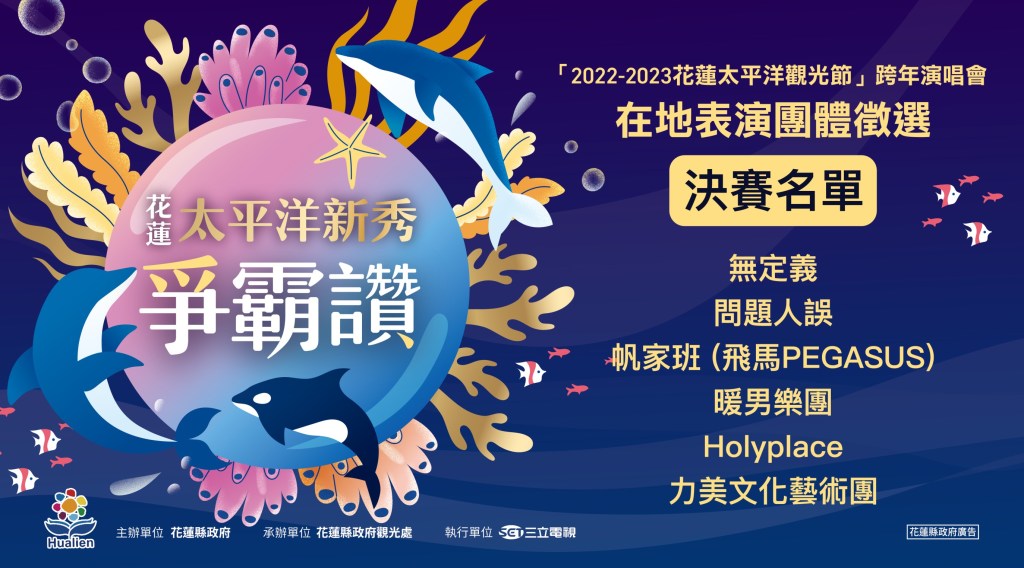 花蓮縣政府舉辦的「2022花蓮太平洋新秀爭霸讚」在地表演團體徵選活動,第一階段初賽在17組報名隊伍中,最後選出6組優秀隊伍挺進決賽,決賽將於11月20日在花蓮文化創意產業園區舉行,由入圍決賽的6組隊伍現場帶來精彩的演出,角逐成為「太平洋之星」的榮譽,並站上太平洋觀光節跨年演唱會的舞台,從花蓮邁向國際。