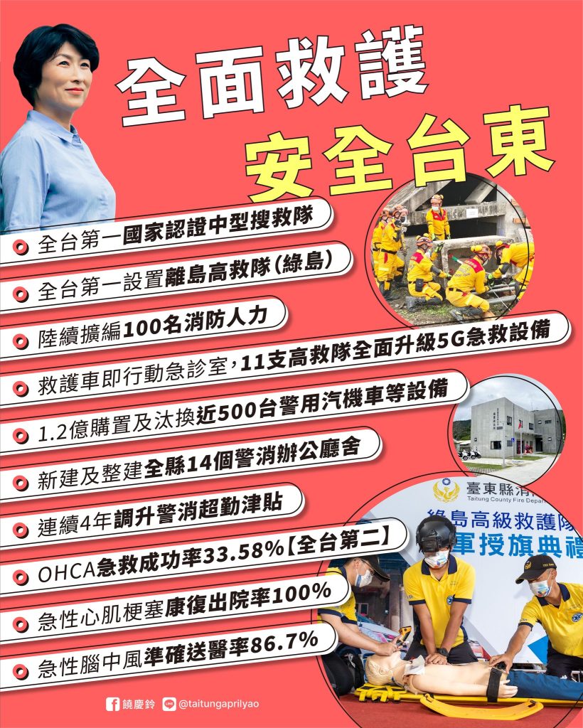 縣長饒慶鈴表示,臺東因幅員廣大,上任以來積極提升縣內醫療及消防等量能,不僅提升消防人力,除了臺東高級救護隊,也陸續成立成功、關山、太麻里、長濱、大武高救隊,甚至綠島也設立全國第一支離島高救隊,逐步打造「救護車等於行動急診室」,目前臺東已有11支高救隊,讓消防成為醫療的延伸,全面提升消防救護能量,守護臺東鄉親與遊客生命安全。因此,110年在到院前心肺功能停止(OHCA)急救成功率達到33.58%榮登全國第2;急性腦中風準確送醫率高達86.7%;護心行動之急性心肌梗塞康復出院率100%;縣民的平均餘命更增加了1.15歲。