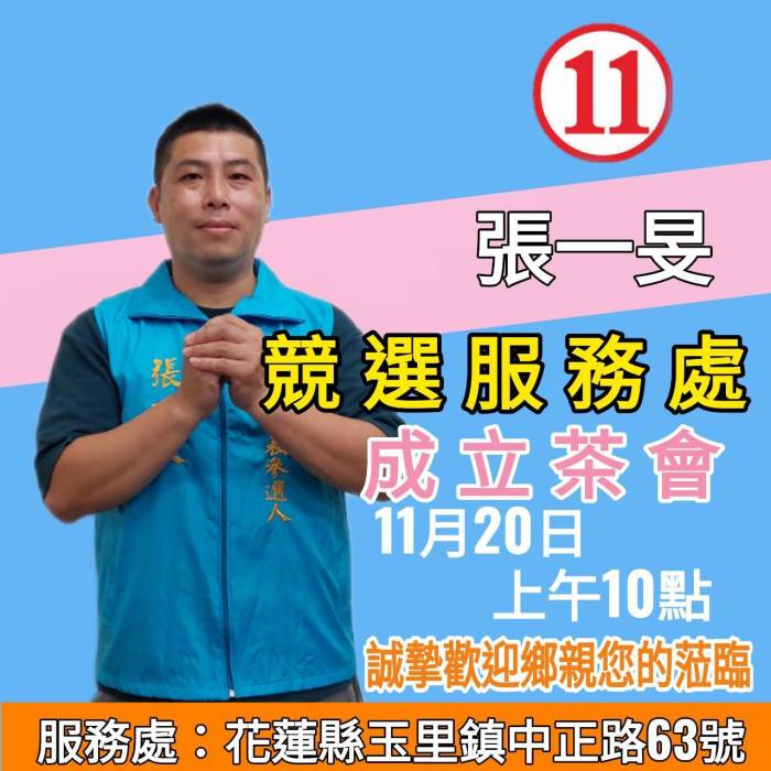 玉里鎮民代表候選人11號張一旻將於20日成立競選服務處茶會