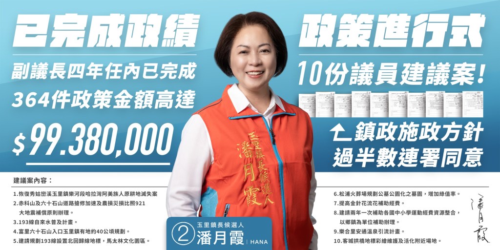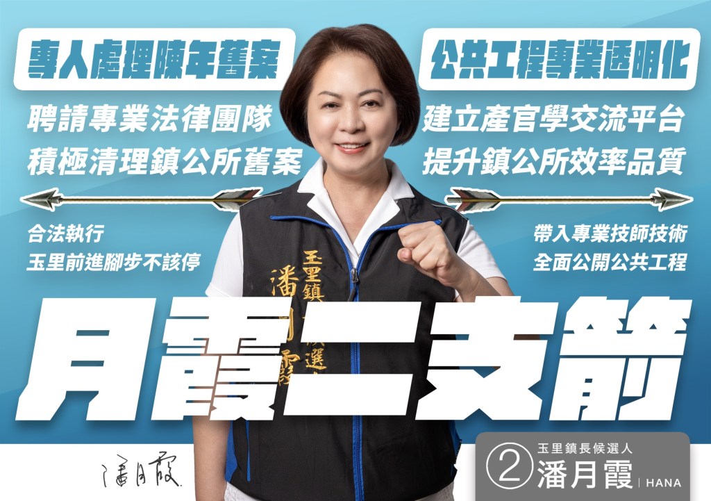 潘月霞副議長在任期間,是一個民意代表的角色,時常至玉里鎮實地考察,也提出過許多惠民的提案,這次選舉所提出的政策也足以看出潘月霞對玉里鎮的了解,這四年需要給她一個表現執行力的機會。大家11月26號要用手中神聖的一票支持自己心目中的候選人,選出一個不會展現官威、有親和力,且願意積極建設玉里的鎮長。