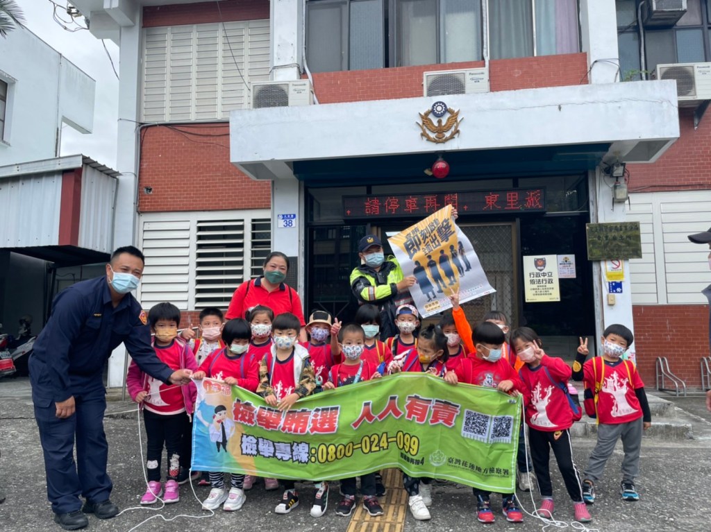 花蓮縣富里鄉東里國民小學附設幼兒園師生們20多名,日前來到花蓮縣警察局玉里分局東里派出所參訪,體驗波麗士的日常生活;現場由副所長邱金雄、警員郭駿育招待幼童,細心介紹警用裝備,解說警察工作內容,進行犯罪預防、交通、婦幼宣導。