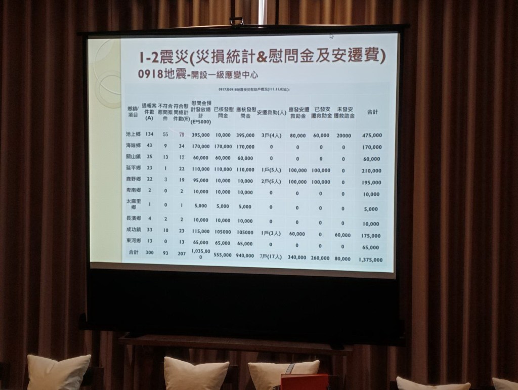 目前對於地震何時何地發生仍無法準確預測,一旦災害來臨即可能對人民生命財產造成嚴重之威脅,對於人力吃緊的社政人員而言十分具有挑戰性,因此平時整備工作的落實更形重要,平時培力在地民間團體參與相關訓練,依專長予以分工,並透過演練熟悉彼此災時角色,唯有公私部門齊心合作,才能匯聚眾人之力,協助災區完成相關復原工作重返生活。會議活動也安排臺東大學王文清教授分享「災害下的企業持續營運」課程,王文清表示,人們容易以為鄉村地處偏遠,救災不易,最需投以關注,但其實身處鄰里關係緊密的地方,社區自救、互助的默契都比都會大城市高出許多。「整體來講都會區的民眾比較脆弱」,城市人大多關係疏離,且因爲生活便利,過度依賴外界資源,不像非都會區的民眾,平時習慣備有物資,或各式災時應變器具。隨著越來越多企業重視ESG指標,要求企業除了傳統的勞工權益與環境責任以外,更需對顧客的災害風險負起責任。 如何減災、避災進而降低人民生命財產的損失,是大家共同努力的目標,期許未來能繼續透過在地公所、專業NGO、社區私及企業團體四方結合,互相協助合作,一同為防災工作努力,打造臺東韌性家園。